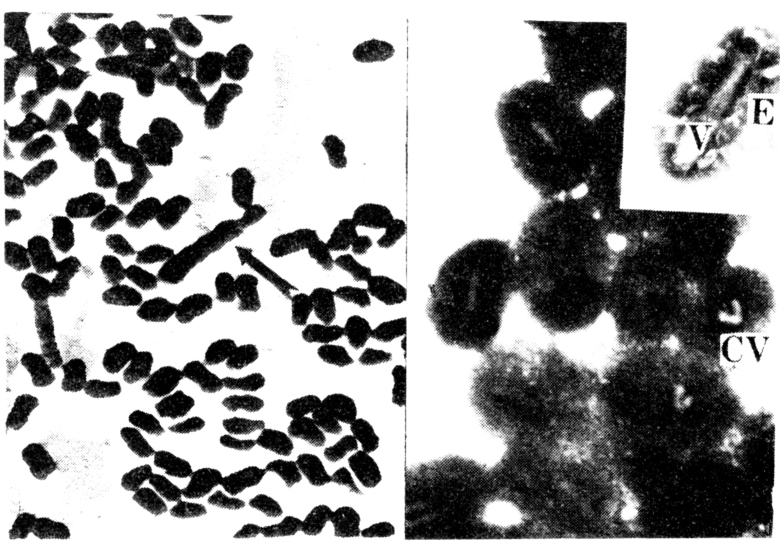 包涵体是一个椭圆形或卵圆形的小颗粒。光学显微镜下几乎接近于分辨率的极限。通常一个颗粒体只含一个杆状病毒粒子,偶然有2个以上的。有些畸形颗粒体比正常者长几倍(左图箭头所指)。颗粒体病毒形态发生较为特殊,有的结晶状蛋白沿着核衣壳从一端往前堆积,也有从核衣壳两端延伸堆积,逐渐形成一个完整的颗粒体。属于B亚组的颗粒体病毒可侵染脂肪体细胞,体壁细胞、气管底膜细胞和中肠肠壁细胞等;可在核内或细胞质内复制增殖。感染途径与同,经口和卵传染,易潜伏感染。罹病早期幼虫外观病征不明显,后期色泽变淡,腹面呈乳白色,体节肿胀,虫尸易液化,体液混浊含有大量的颗粒体病毒。发病过程较长,一般需5~25天死亡。寄主范围特异性较高,很少有不同科、属间相互感染的现象。其遗传物质是双螺旋结构的DNA,分子量较大。主要侵染鳞翅目的多种昆虫。是一种有应用前途的微生物杀虫剂;中国研究的菜青虫GV等已获较好防治效果,国外对GF的研究和应用也有成功之例。