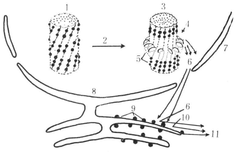 上述激素中唯有蜕皮激素和保幼激素已经提纯和鉴定,二者均直接作用于靶细胞染色体。激素分子首先与血淋巴中的载体蛋白结合,被输送到靶细胞核内与染色质的酸性蛋白(与哺乳动物组织中的类固醇激素受体蛋白相似)紧密结合,使染色体部分膨胀,从而活化特定的基因并以m-RNA的形式释放遗传信息。带有特定信息的m-RNA进入细胞质内编译出特异的蛋白质(酶),例如,蜕皮激素明显刺激皮细胞中多巴脱羧酶的合成;保幼激素刺激家蚕后丝腺细胞丝蛋白的合成等。蜕皮激素和保幼激素的作用均在活化染色体上的基因,即活化一定部位的DNA,DNA转录为RNA合成蛋白质(酶),从而催化特定的代谢过程表现出生理功能(图2)。