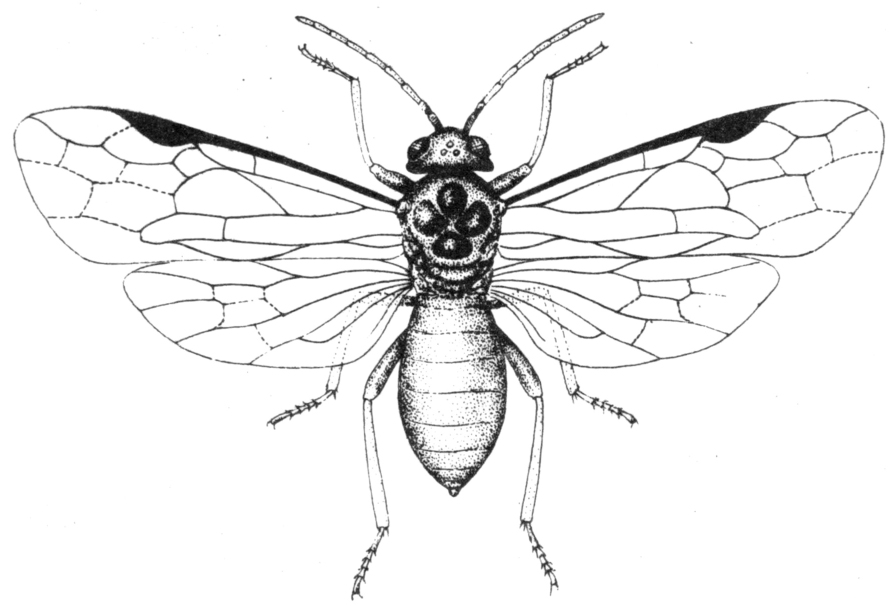 梨树花萼、幼果害虫。学名Hoplocampa pyricola Rhower。膜翅目,叶蜂科。分布于日本、朝鲜及中国辽宁、华北、华东、西北、华中和四川。梨早花品种受害较重,晚花品种受害轻。成虫黑色,有光泽。雌虫体长4.5毫米左右,翅展约11毫米。雄虫体长约4毫米,翅尾约9毫米。触角丝状9节,除第一、二节黑色外,其余7节雌虫色褐、雄虫色黄。翅淡黄色透明。足细长,基节、转节和腿节大部黑色,以下黄色。雌虫腹面后端中央呈沟状,锯形产卵器及鞘藏沟内。雄虫腹面后端有大形腹板遮盖,交配器黑褐色。卵椭圆形,白色透明。末龄幼虫长约9毫米,淡黄白色,头部橙黄色,半球形,有黑单眼1对;触角圆锥状5节;腹足7对,腹端背面有黄褐色斑,上有多数小黑点。裸蛹,长约4毫米,宽约2毫米,乳白渐变黑褐色(见图)。