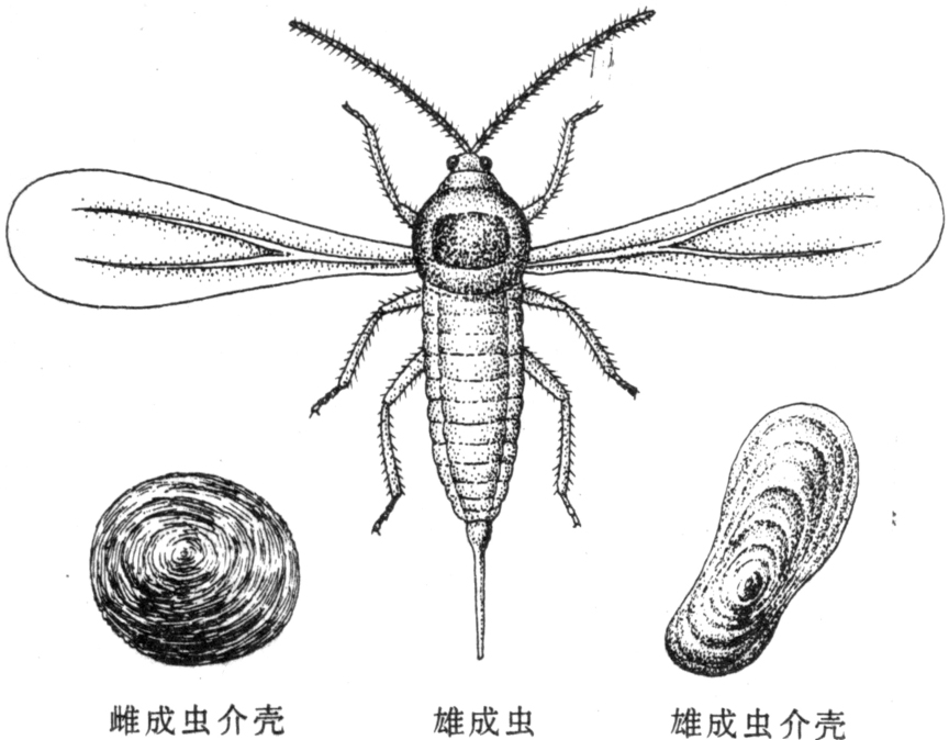 虫体扁椭圆形,橙黄色,口器丝状位于腹面中央,眼及足退化。雄虫介壳长椭圆形,灰白色,壳点偏向一端。虫体橙黄色,眼暗紫红色,口器退化,触角念珠状,11节。翅1对,交配器剑状。若虫体长0.2毫米,椭圆形,橙黄色,足3对发达,尾端有2根长毛。雌若虫蜕皮3次,介壳圆形;雄若虫蜕皮2次,介壳长椭圆形。化蛹于介壳下,蛹淡黄色,圆锥形(见图)。