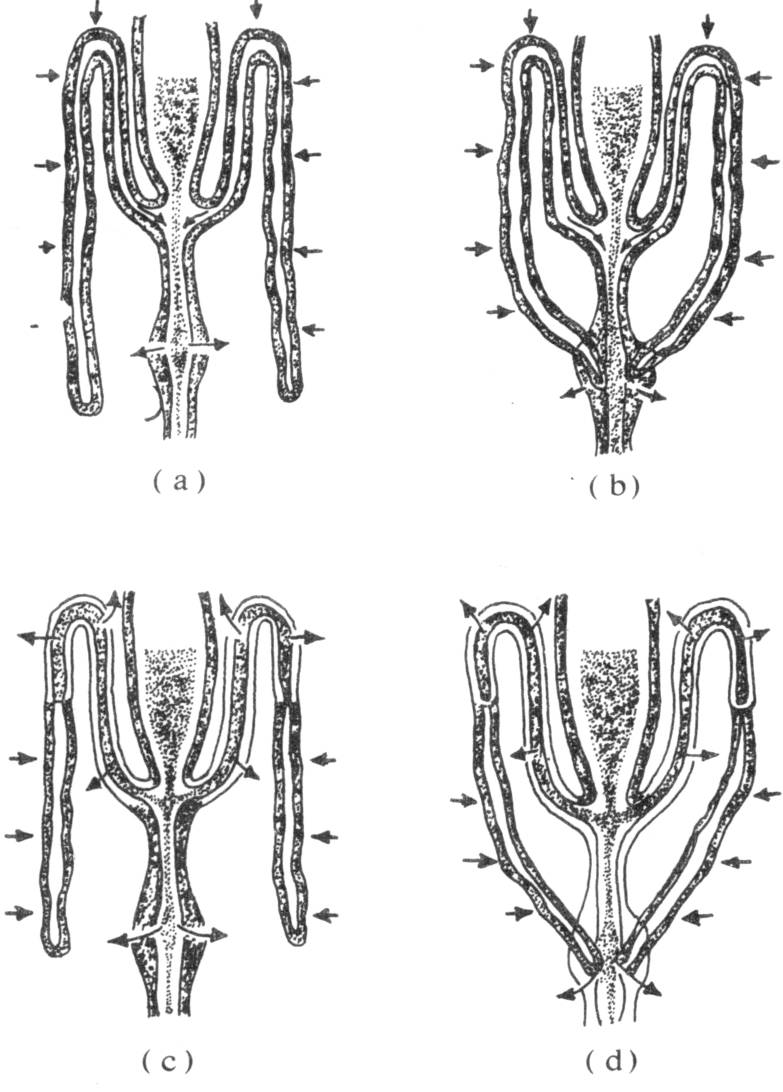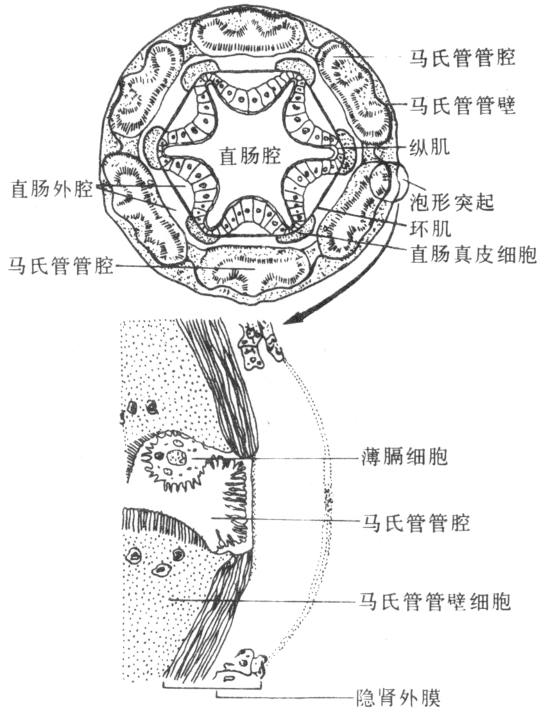鞘翅目和鳞翅目昆虫马氏管末端贴附于直肠,形成“隐肾”结构。如黄粉甲(图3)马氏管端段以盘旋形、辐射状排列,围绕于直肠外面,马氏管与直肠间有一个空间——围直肠腔相隔。直肠腔、围直肠腔和马氏管腔之间具有复杂的内在联系。近血淋巴一侧的“隐肾”中马氏管外壁有很多分散的泡形突起,壁薄,称薄膈,能将血淋巴中的钾离子移入管腔。血淋巴中的水受围肾膜和薄膈的阻挡不能进入马氏管,管液渗透压明显高于血淋巴和围直肠腔液。围直肠腔的水从前端的低渗透压处流向后端的高渗透压处时,能不断渗入马氏管腔。围直肠腔内的渗透压高于直肠腔,使直肠腔内的水能流进围直肠腔中,即水流方向总是从直肠腔进入围直肠腔和马氏管腔,最后从隐肾部分的马氏管流进游离于血腔中的马氏管部分,大部分水随马氏管多余的钾离子回收到血淋巴中,故“隐肾”是充分回收水分的特效系统。鳞翅目幼虫“隐肾”系统中无薄膈,不能回收水分。