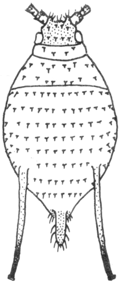 偶发性棉、豆类作物的刺吸害虫。又名棉无网长管蚜、大棉蚜。学名Acyrthosiphon gossypii Mordvilyio。同翅目,蚜科。分布于印度、土耳其、伊拉克、以色列、埃及、阿尔及利亚、苏丹、苏联;中国仅分布于新疆和甘肃。寄主植物有棉、苦豆子、骆驼刺,也可取食圆叶锦葵、黑绿豆、蚕豆、木田菁、豇豆、甘草、草藤眉豆、芽豆和绿豆等。无翅孤雌蚜体长3.7毫米,草绿色,被蜡粉,附肢色淡,仅触角第二至第六节关节处及第六节基部与鞭部相接处、喙顶端、各腿节顶端及跗节、各胫节端部、腹管顶端、尾片尾板及生殖板深色。头部额瘤外倾,触角稍长于身体,第六节鞭部为基部的3~4倍,第三节基部有小圆感觉圈1~3个,腹管很长,约等于触角第四、五两节之和,可达体长之半或1/3,尾片有长毛8~12根(见图)。有翅孤雌蚜触角第三节基部2/3有小圆感觉圈10~20个。