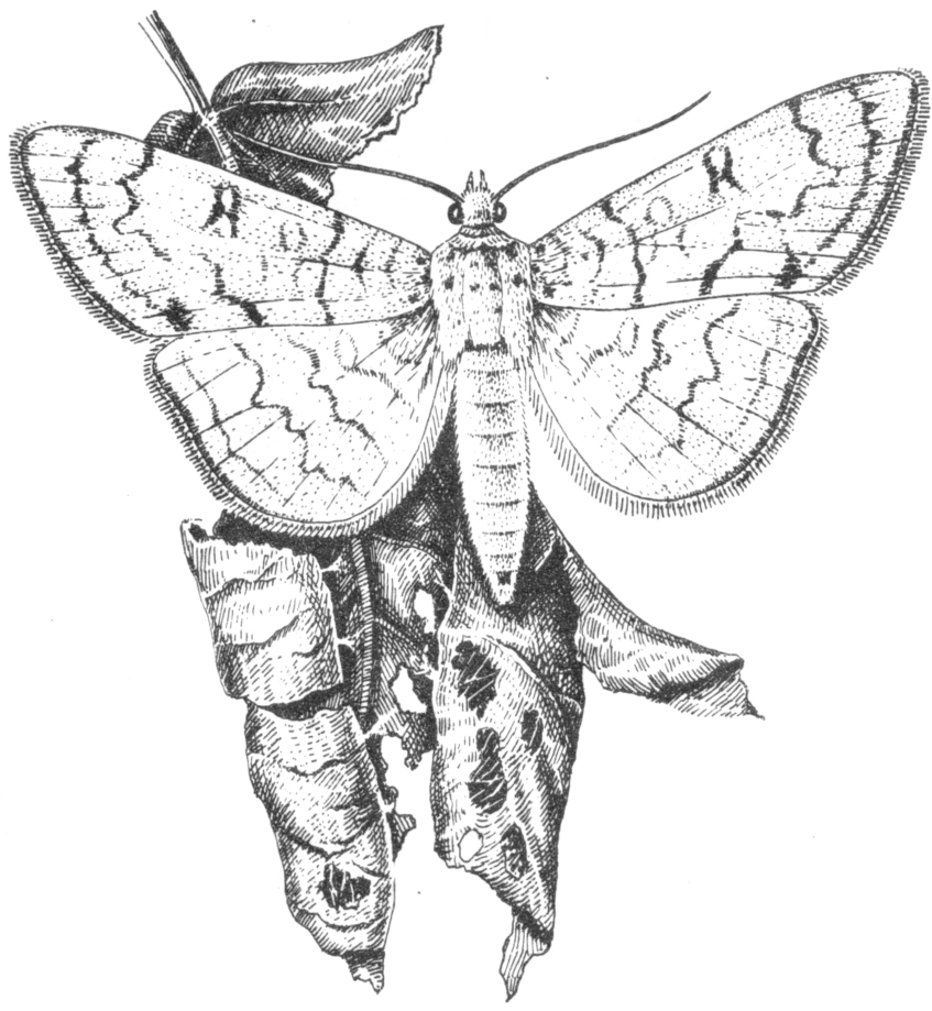 成虫体长10~14毫米,翅展22~30毫米。体黄白有闪光。触角线状,长度超过前翅前缘之半。腹部乳白色,各节前缘呈黄褐色带状。前、后翅的外缘线、内横线均为褐色波状纹,前翅中央前缘处有似OR形褐斑,在R斑下有一黑线(见图)。卵、扁椭圆形,紧贴叶背叶脉两边,长约0.12毫米,宽0.09毫米,初产乳白色,后变淡绿色,孵化前灰褐色。末龄幼虫体长约25毫米,青绿具闪光,化蛹前为桃红色,全身有稀疏长毛,胸足、臀足黑色,腹足半透明。蛹红棕色,长13~14毫米,细长如竹笋,从腹部第五节到末端具刺状突起。
