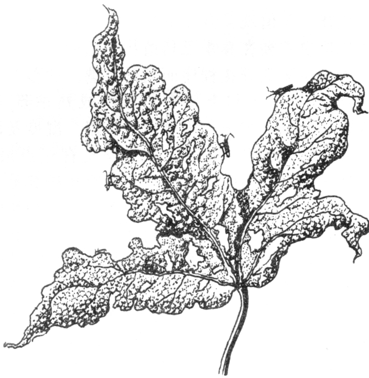 常为害棉花的顶芽、边心、花蕾及幼铃,吸食棉株汁液。棉苗真叶芽甫露,盲蝽就用针状口器刺吸幼芽,顶芽受害枯焦发黑成无头苗;真叶期为害顶芽成黑斑,组织坏死;顶芽叶片伸展时,坏死部分成孔洞,近主脉处叶片破碎。被害叶片破孔边缘愈合成为特殊的叶切状,与一般咀嚼口器昆虫造成的虫孔不同。若为害严重。叶切状叶片连续多片,使棉株破叶累累呈“破叶疯”,现蕾稀少,影响产量。果枝伸展后的边心嫩叶也会出现上述类似症状,叶片受害后主脉扭曲,叶片不能平展(图3)。