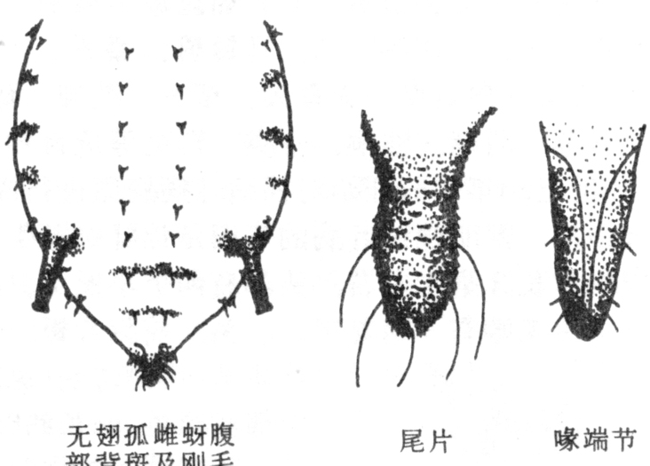 触角第三节有次生感觉圈7~14个,一般9个;第四节有0~4个;第五节偶有一个。雌性蚜成虫草绿色,个别黄色,触角5节,后足胫节膨大为中胫节的1.5倍,有多数小圆形性外激素分泌孔,尾片有毛6根,透过表皮可观察到腹中的卵,这与孤雌蚜腹中有胚胎不同。有翅雄蚜体狭长卵形,腹部各节背中央各有一黑横带,触角第三至第五节依次有次生感觉圈33、25、14个,尾片有毛5根(见图)。