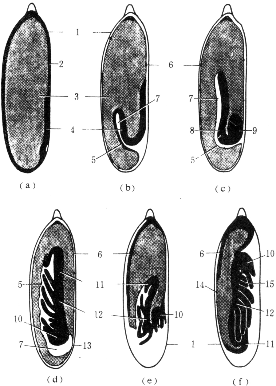 图1 白蚁Zootermopsis的胚胎发育早期,示胚胎在卵黄表面发育(其羊膜不现于图内)及胚动的反向移动
