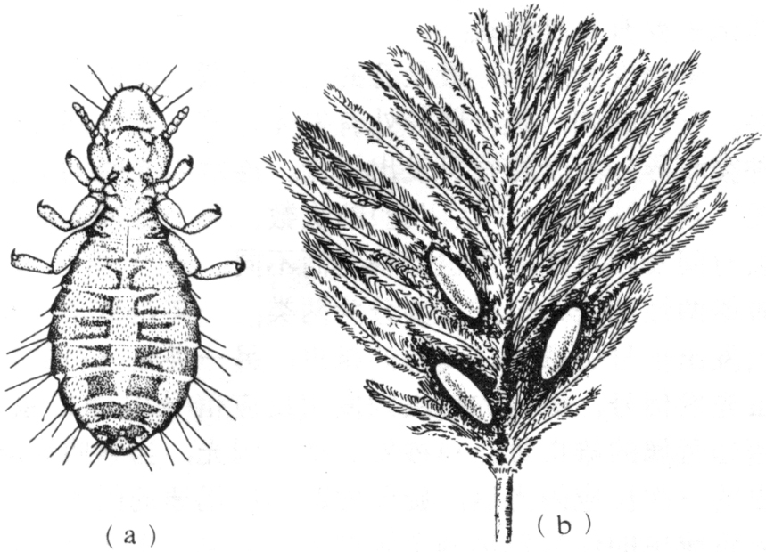 一般寄生于鸟类,少数寄生哺乳动物体外,取食羽毛和皮肤及其分泌物等,利用锐利的上颚咀嚼,但不直接吸取血液。被寄生的鸟类羽毛脱落,死后的鸟体上的羽虱尚可生存2小时至3天。一年发生多代,世代重叠。卵长椭圆形,粘附于寄主羽毛或毛的基部(图b),一般经2~4天孵化。若虫3龄,约3周达到成虫期。寄主有鸡、鸭、鸽类以及犬、猫、马、牛等,野生动物寄主已知有熊、野猪、鹿、海狸等。本目若干种类为畜牧业重要害虫。