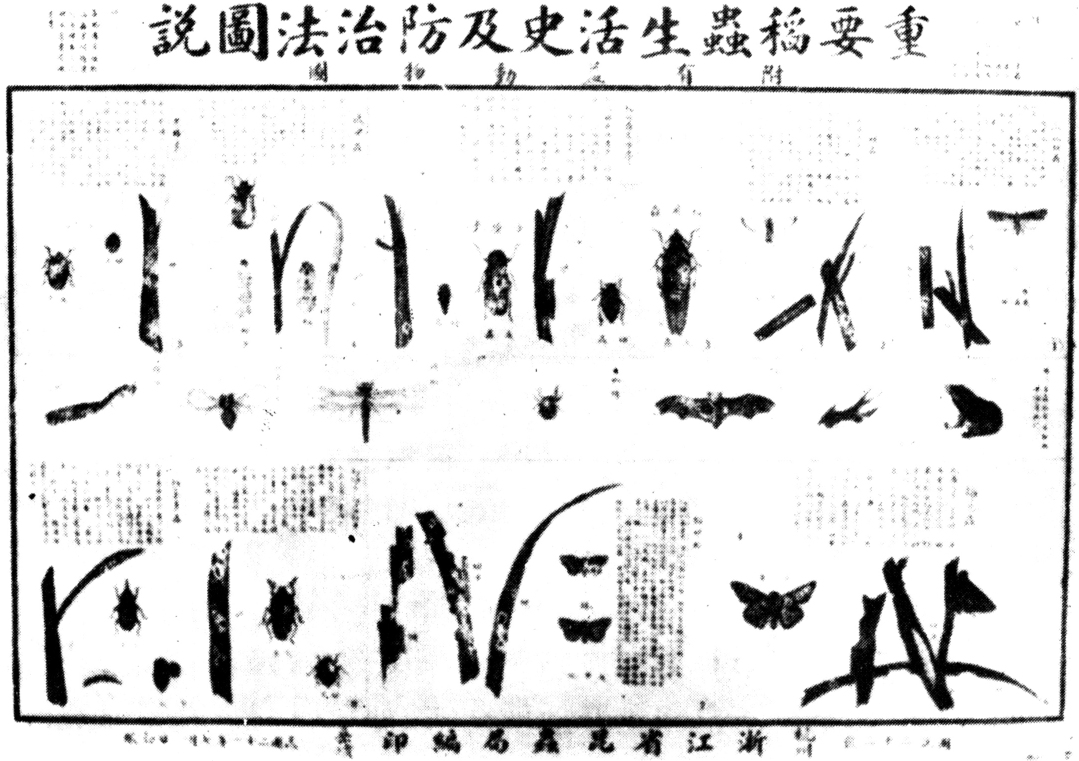 随着西方近代昆虫学的传入,20世纪初开始,中国的稻田虫害防治,也由凭经验治虫向用科学治虫发展。1918年江苏组织螟虫考察团,赴苏松地区调查螟害情况及螟虫生活习性,指导农民用科学方法治螟。治虫方法着重两个方面:主要由科研机构和高等院校,研究稻虫生活习性危害情况和防治办法,对害虫的测报,是其研究的重要方面。成果有:1933年首次对中国螟害试行预报,1934年提出稻飞虱类和稻叶蝉类发生预察法;1936年制订了螟蛾预测及气候观察法等。其次是对农民进行科普宣传,提高农民的昆虫知识水平。浙江省昆虫局绘制《治螟月令图解》、《重要稻虫生活史及防治图说》(图1)张贴宣传,制作螟虫生活史和为害标本供人参观;江西南昌农事试验场印发《治螟浅说》等。