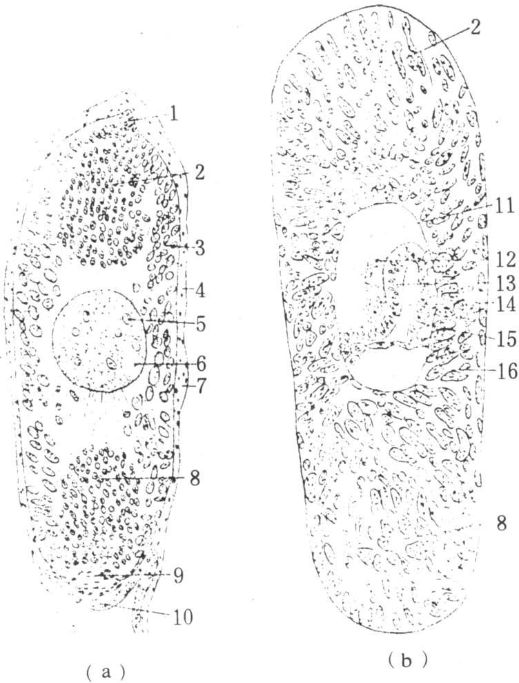 舌蝇的卵巢管是多滋式的。卵巢其端部原卵区的卵原细胞在一卵室内,经4次分裂,产生16个细胞,一个是卵母细胞,位于卵室的下端,其余15个是方形的营养细胞,包围着卵室的是卵泡细胞。营养细胞周围的卵泡细胞,在不断地分泌营养物质活动时,仍为方形(图6),到发育后期,该细胞层逐渐变薄,成鳞片状组织,失去分泌与运输营养物质的功能,而围绕着卵母细胞的卵泡细胞仍维持原来形状(图7)。这时的营养细胞再没有由卵泡细胞分泌的营养物质,贮存在营养细胞的营养物质随着卵细胞的发育而减少,其后,细胞核膜破裂,核内物质流入细胞质中作为供应卵细胞发育之用。成熟的卵细胞,连同卵壳经输卵管排到子宫中,受精后即停留在子宫中发育到幼虫孵化。
