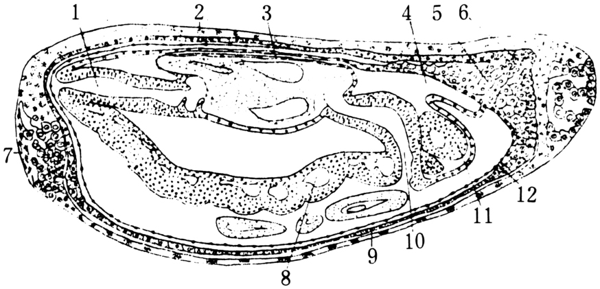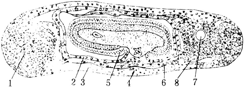 图7 同上,接近成熟期卵室前部及后部的纵切面