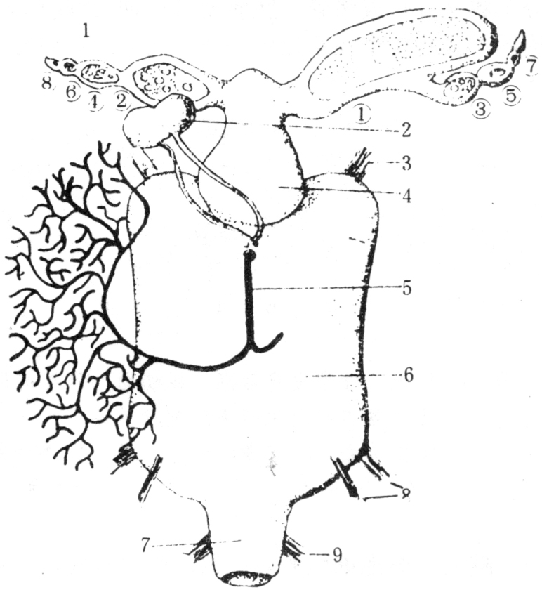 舌蝇具有高度特殊化的生殖器官,卵巢有一对尖带状卵巢管。每一卵巢管常有4~5个卵泡(follicles)。两个卵巢管内的卵细胞,不是同时发育,而是轮流产生一个成熟卵。其顺序如图中数字①~⑧。因此,左右卵巢的大小不对称。侧输卵管短小,中输卵管后端宽,接着膨大的子宫(生殖腔)。受精囊及附腺(乳腺)均开口于子宫前端。其后端连接短窄的阴道(图5)。