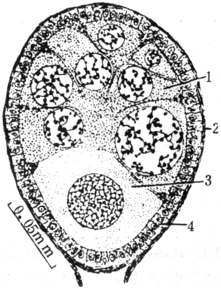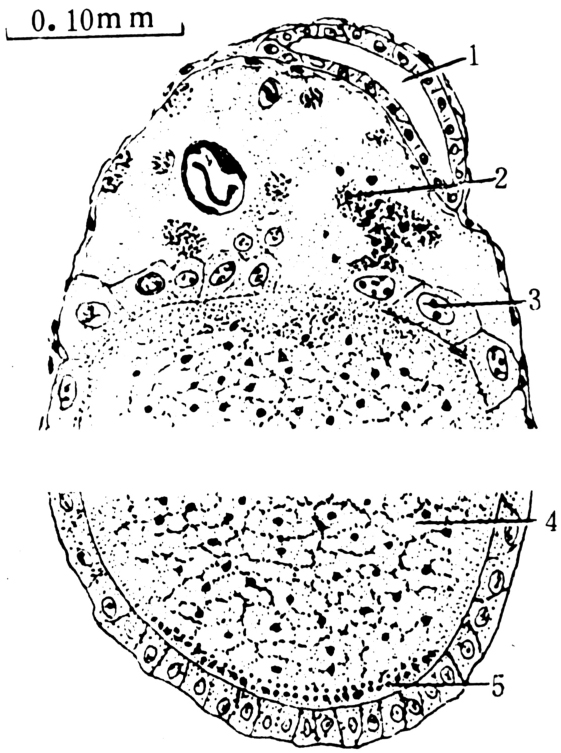 中肠形成时,剩余营养细胞储藏在肠腔中,至胚胎发育完成后,营养细胞被吸收殆尽,成为空腔(图4)。 图1 鼠瘦Hemimerus talpoides的卵巢管生长区纵切面 图2 蠼螋胚胎发育期间纵切面,示胚带进一步形成 图3 同上,胚带发育后期的纵切面,示在前母体假胎盘中的退化卵泡细胞及黄体 腺营养胎生胎生的一种方式,其胚胎在卵巢管内发育