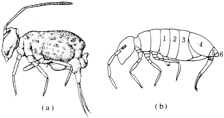 小型昆虫,体长0.2~10毫米。体色白、蓝、红或绿等。多数种类体被细毛或鳞片。无复眼,但头两侧有由8个或8个以下小眼组成的小眼群,有些种类无小眼。触角长短不一,短于头部或长于体躯,一般4节或为6节,末二节常具各种形态的感觉器。头部在触角后方有特殊的感觉器,称角后器。口器咀嚼式或刺吸式,陷入头部颇深,为内口式;上颚细长,尖端有齿,下颚尖端成球状,下唇退化。胸部3节,一般相似,但长角跳虫前胸常退化。合腹亚目的胸部和腹部密切结合,几无分节痕迹。足的胫节和跗节常愈合成胫跗节。足端一爪,有时爪的里面有一爪型的垫,称为小爪(unguiculus)。腹部最多6节,第一、三、四节的腹面有特化的附肢,第一节腹面生有腹管,或称粘管(collophore),第三节生有握弹器(tenaculum),第四节生有弹器(furcula),生殖孔开口于第五节腹板的后缘,肛门位于第六腹板后。无马氏管,排泄功能主要由代行。以体壁呼吸或在头胸间有一对气门(见图)。
