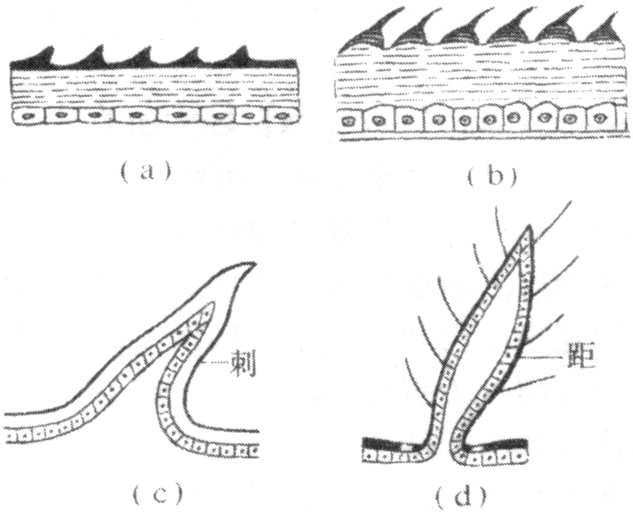 体壁单细胞外长物 体壁表面的向外突出物,如刻点、刻纹、突起、瘤、脊及刚毛、鳞片、刺或距等。组织学上可分为两大类。一类为非细胞性外长物(图1a、b),指突起部分单纯由表皮形成,没有皮细胞参与,包括微毛、小刺、皱折、条脊及棘。另一类为细胞性外长物(cellular processes)(图1c、d),指突起部分有皮细胞参与,又可分为多细胞和单细胞外长物两类。