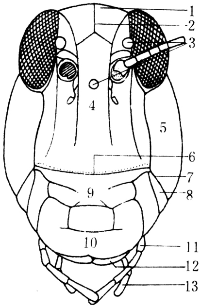 昆虫头壳被沟划分成的各块骨片。次后头沟可能代表原始的体疗间界限,其余全是为加强头壳或着生肌肉的后生沟(图1)。