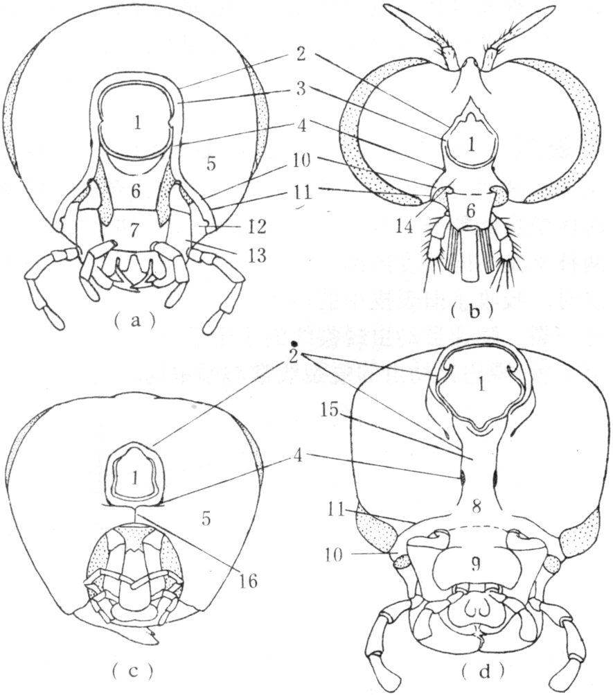 头的后部在一些类群中变化较大,双翅目昆虫头后部两侧的口后片在头孔下方相遇,形成口后桥(图2b)与次后头相连。膜翅目昆虫等两后颊相向生长,在头孔下方形成后颊桥(图2c),它以次后头沟与次后头为界。很多前口式昆虫的次后头腹端两侧合并,随着颊和后颊向前延伸,在后颊之间形成一块骨片,称外咽片,它的两侧以外咽缝与后颊为界(图2d),在两侧后颊扩大时缩减为一条狭带,有时两外咽缝在中部合并成一条。外咽片常与下唇的亚颏合并成一块骨化板,称为咽颏。