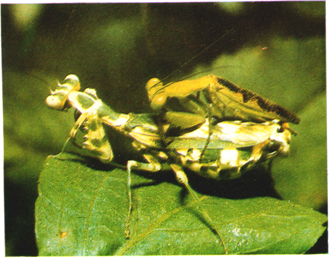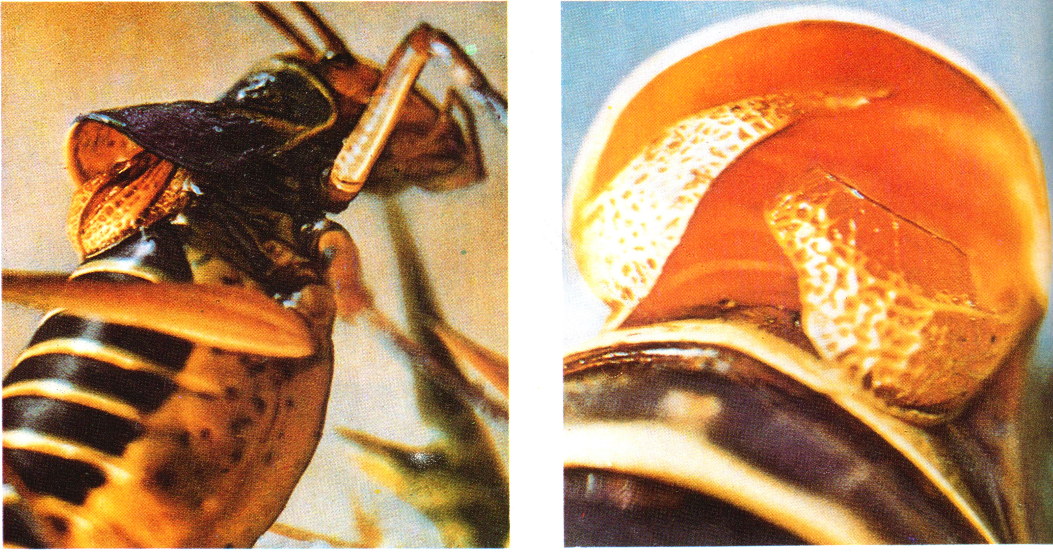 ▲163 螽斯的发声器官(左)背部的发音器官(右)利用一对短翅翼片摩擦发声