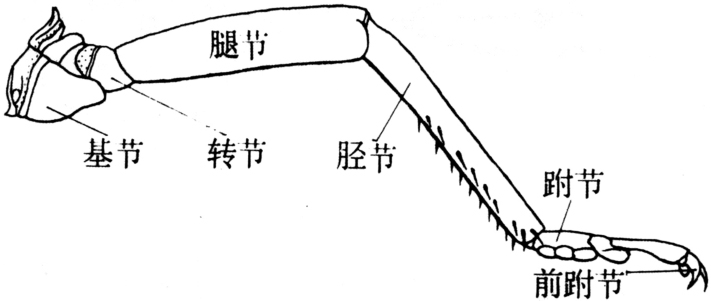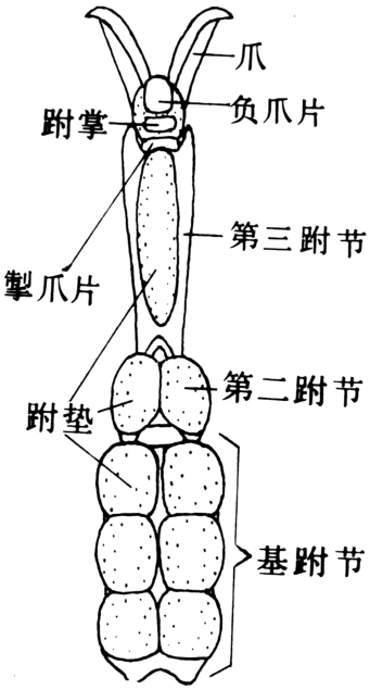 常分6节,自基部向端部分为基节、转节、腿节、胫节、跗节和前跗节(图1)。①基节较粗短,筒形或锥形,基缘有一基节关节点与胸部侧基突相支接,为牵动全足运动的关节构造。一些类群有基外片在前面支接;末端以前,后两关节突与转节相接。基节基部的横沟为基脊沟,被划分出的窄缘为基缘片(coxomarginale或basicoxite),在关节臼后方的基缘片略宽,特称后基节。足以基缘片周围的基节膜与基节臼连接。此外,基节常有1条顺侧板侧沟而下的沟,称基节沟。②转节一般较小,端部以背腹关节与腿节紧密连接,唯蜻蜓目昆虫转节分为两节。③腿节常为足中最长的节,末端同胫节以前后关节相接,两关节的背腹面有较宽的膜,腿胫节间因而可作较大范围的活动,使胫节可以折贴于腿节之下。④胫节细长,较腿节稍短,边缘常有成排的刺,末端有距,控制胫节的肌肉源自腿节⑤跗节较短,全变态类的幼虫保持原始不分节的形式,成虫则分为2~5个亚节,第一节称基跗节,各亚节间有膜,但无肌肉。整个跗节的活动由源于胫节的肌肉所控制。跗节腹面常有成对的肉质跗垫。⑥前跗节位于足的末端,呈锥状,见于原尾目、弹尾目及一些鳞翅目、鞘翅目、膜翅目叶蜂科等的幼虫。多数昆虫的前跗节为源于跗节端部膜质中的一对爪及一个中叶,即中垫。愈高等的昆虫,其前跗节愈退化。爪着生在跗节端部背面的负爪片上。爪内中空与跗节相通。跗节在端部有一小骨片,称掣爪片,端部与爪的降肌腱相接。掣爪片常分为两个骨片,端部的另称跗掌(图2)。爪在各目昆虫中变化较大,食毛目、虱目、同翅目介壳虫仅具一爪,缨翅目昆虫大多数无爪,只有一囊状中垫。许多昆虫在爪间有这样的囊状中垫。双翅目昆虫在掣爪片上往往具一片状或刺状突起,称爪间突;有的爪从基部发生一个伸于爪下的瓣状构造,称爪垫。前跗节及跗节上的垫状构造多为袋状,内充血液,下面凹陷,便于吸附在光滑物表面,有时垫状构造的表面被覆着管状或鳞片状毛,称粘吸毛或鳞毛,毛的末端为腺体分泌物所湿润,以辅助攀缘。