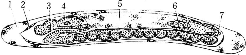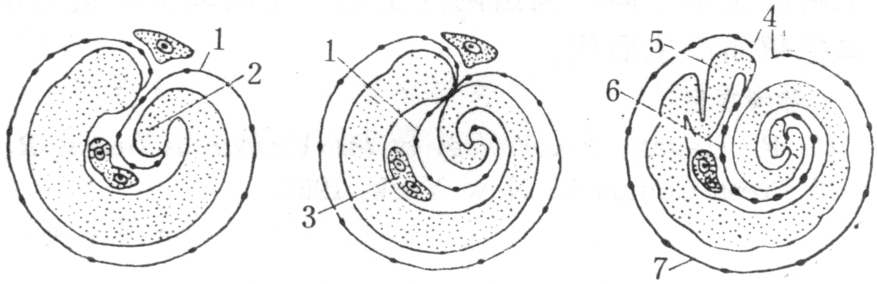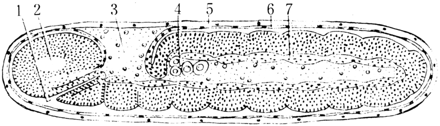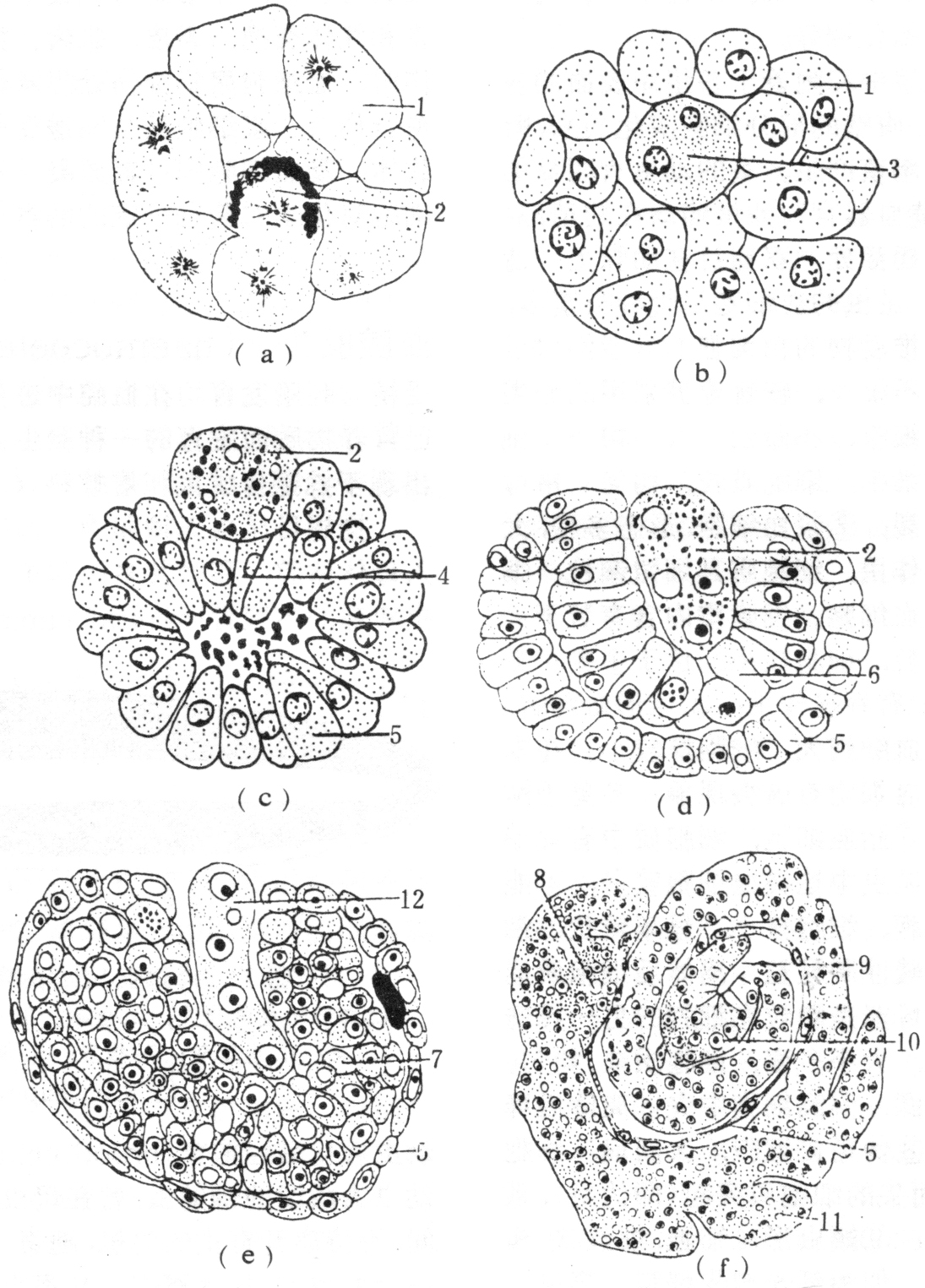其后分裂球重新排列,卵中央的分裂球移向卵表面,在卵黄细胞之下一小部分,稍下陷。中央部分成空腔,腔中满藏由细胞内端分泌的颗粒状物质,这些是暂时存在的物质,不久即消失(图2c)。在卵黄细胞下的细胞,挤向中央,下陷成杯状,卵黄细胞藏于其中。杯壁分为内外两层,将分别形成胚带与胚膜(图2d)。内层恢复分裂增殖,在周缘的细胞分裂较迅速。内层细胞保持原形状,成为较厚的胚带,外层细胞逐渐变薄变小,形成较薄层的胚膜。单层的胚带发育成多层。胚膜变薄,卵黄团变长(图2e)。由于胚带向上弯曲其前端与后端逐渐接近,几乎相遇于背方。前端部停止于此,后端部继续延伸,成螺旋形弯卷。停止延伸时,头叶明显,同时出现口道及肛道。在胚带延伸过程中,出现一定数目的横纹,表示胚体分节的开始,附器也随而形成(图2f)。