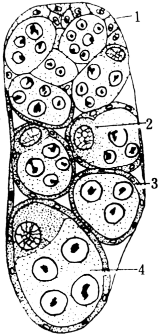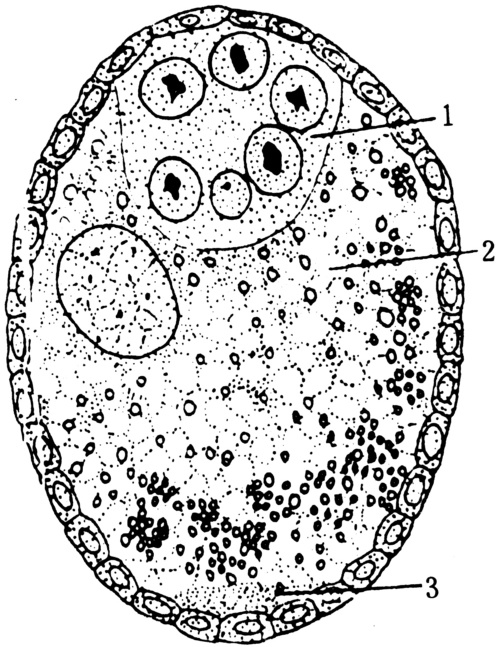 在极质区的卵原细胞,经3次同步分裂,产生8个细胞之后即行停止。随着在卵裂过程中,营养细胞供应大量营养物质,致使营养细胞的体积逐渐缩小而至消失。