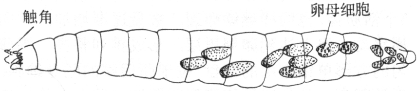 在极质区的卵原细胞分裂的当时,极质区以外的3个活质体,也同样继续卵裂,数量逐渐增加,并向外周移动,终于达到卵周质层,形成排列整齐,厚薄均匀的方形单细胞层的胚盘。位于卵后端的胚盘细胞,由于被胚盘之外的卵原细胞群所挤压,稍向内挤,把胚盘后端的背部及腹部分开,其中的一些胚盘细胞向内移进卵黄区,形成典型的消黄细胞(图8a)。在胚盘后期,位于腹面的胚盘细胞,由方形变为柱形,构成较厚的细胞层,即胚带的原基,称为腹片。腹片前端宽、短,为头叶原基,后端向后伸,围绕着卵母细胞群(图8b)。胚盘背面部分为原来的较薄的胚盘细胞层后端,亦同时迅速向后伸展,绕过卵的后端与腹片细胞层相遇,其后继续以正常典型方式形成胚膜及中胚层即进入胚带期。胚带后端向后极度伸展,到达卵的后端时,即弯向背方,然后转向头端伸展。在卵后端的卵原细胞群亦同时向前移动,到达将接近胚胎头端时,停止前进(图9)。在胚带延伸过程中,出现一定数目的横纹,显示胚体分节开始,随着胚体分节发生过程,胚动开始,胚体逐渐缩短、变直,出现胚胎的腹面部分(图10)。在此基础上发育成为幼虫。孵化的幼虫,仍留在母体体腔中生活,以母体脂肪体及器官组织为食,继续生长发育,至母体组织消耗殆尽,破母体而出;进行自由生活,这样幼虫的体内又以同样的发育方式产生下一代幼虫,这类昆虫是一种世代异态交替的,幼体生殖产生若干代以后的成熟幼虫化蛹,变成成虫,产生两性生殖个体,又由两性生殖产生的幼虫,进行幼体生殖而产生后代。