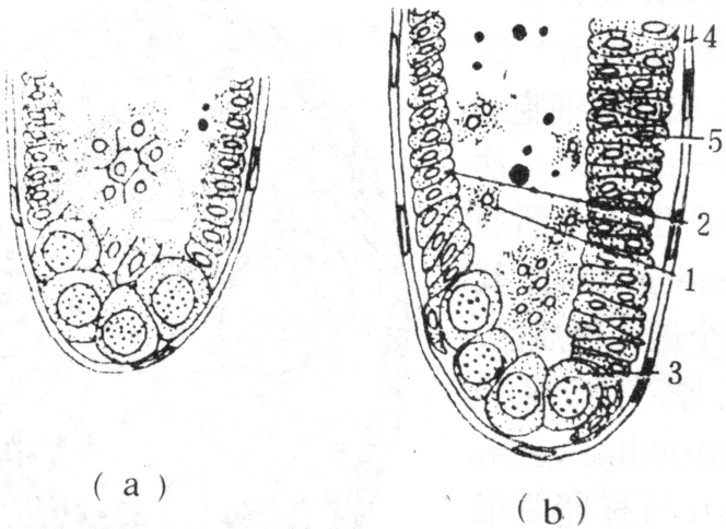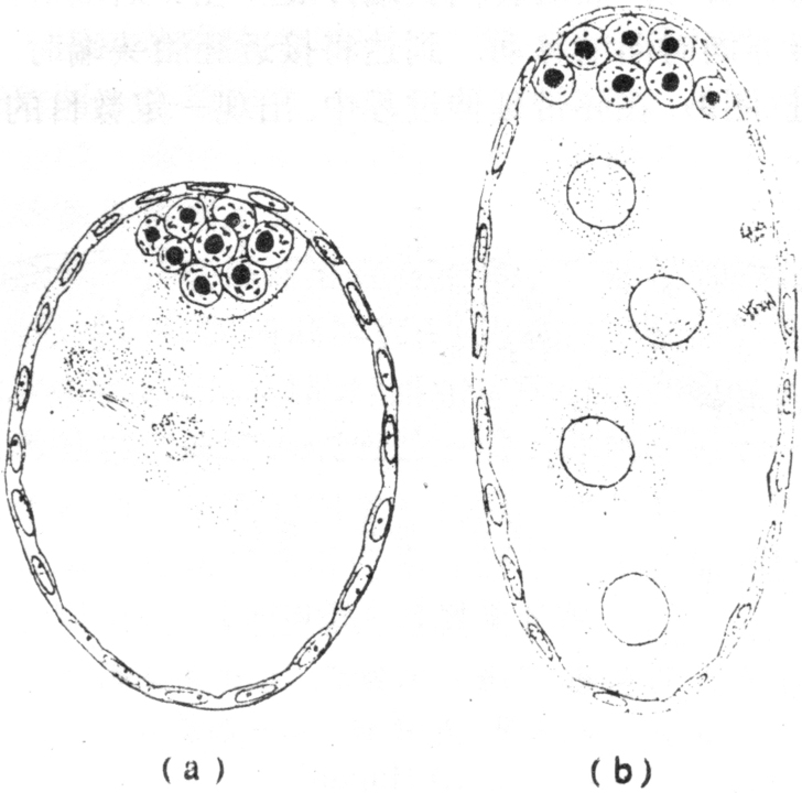 污瘿蚊(Miastor)的繁殖属于幼体生殖方式,卵细胞的形成及胚胎发育,均在母幼虫体腔中进行,由于幼体生殖是属于单性生殖类型,生殖细胞的成熟分裂,没有减数分裂程序,而是以有丝分裂方式进行,产生双倍体染色体的卵母细胞。瘿蚊幼虫具有两个卵巢,在成熟的卵巢内具有一定数量的卵母细胞,每一卵母细胞,陪伴着若干个营养细胞,被包围在由单细胞层构成的囊泡中(图4)。囊壁细胞层来源于母体(幼虫)的中胚层,其结构与一般昆虫卵巢的卵泡细胞层相似,当卵发育成熟后,卵巢破裂将卵释放到母幼虫血腔中,继续发育(图5)。成熟卵无卵壳,在囊泡中进行胚胎发育。卵细胞核位于卵的一边,营养细胞位于囊泡的前端,其后端有极质(pole-plasm)区(图6)。成熟卵细胞经过第一次及第二次卵裂产生4个活质体(energid)时,其中一个进入极质区,形成原生殖细胞(primordial germcells);可称卵原细胞(图7),其余3个活质体继续卵裂,形成胚盘。