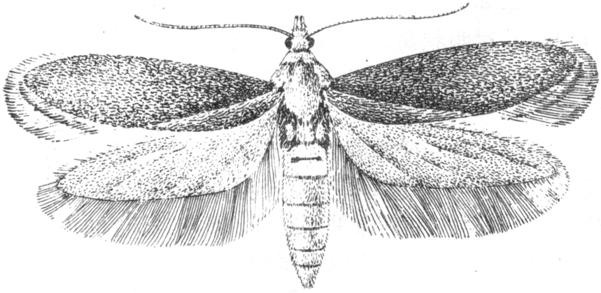 成虫体长5.5~7毫米,翅展13~13.5毫米,土黄色。前翅散有黑褐色鳞片,略带银灰色光泽,第五径脉由第四径脉1/4处分出;后翅梯形、灰褐色。雌蛾腹部末端丛毛排列整齐(见图)。卵长椭圆形,表面有粗糙皱纹。末龄幼虫体长10~13毫米,色黄白,胸部稍肥大,虫体多皱褶,第三至第七腹节7毛3根单独着生,第九腹节4、5毛在一毛片上,6毛单独存在。腹足趾钩环形单序,趾钩约14~15个;臀足趾钩单序横带,趾钩约9个。蛹纺锤形,长5~8毫米,棕色,触角伸达翅芽末端内侧,后足伸超翅芽末端。臀棘微小、钩齿状,两侧着生尖端弯曲的刚毛。