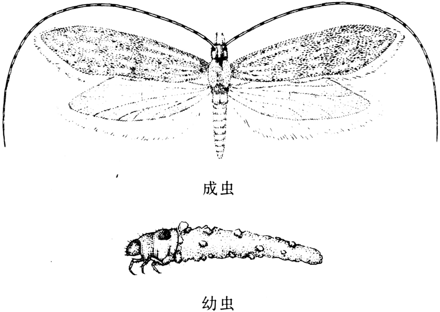 水稻苗期害虫,又名泥苞虫。学名Setodes argentata Matsumura。毛翅目,长角石蛾科。分布于东亚及中国东北、华北等地。1938~1942、1948年曾在东北稻区严重为害。以幼虫咬断稻秧嫩芽或须根,造成漂秧。害稻石蛾尚有长角石蛾科的麻纹长角石蛾和沼石蛾科的稻黄石蛾。成虫体长约5毫米,翅展13~14毫米,色浓褐。头顶有“小”字形银白条纹,触角长约为前翅的2倍,各节具黑白相间的斑纹。前翅细长,密生黄褐短毛,布有黑褐斑点,有20~22条长短不一的银白线纹;后翅灰暗,半透明。中、后足胫节各有距两个。卵圆球形,黄绿色。卵块由几十粒至几百粒卵组成,周围有透明胶质包裹。末龄幼虫体长7~8毫米,头部及前、中胸黑褐色,后胸黄褐。前足短,后足长。腹部第二至六节具灰白丝状鳃,其分布数各节依次为10、8、6、6、2。蛹长6~7毫米。裸蛹,头、胸及足黄褐色,触角显黑白斑,腹部青绿色,也有气管鳃(见图)。