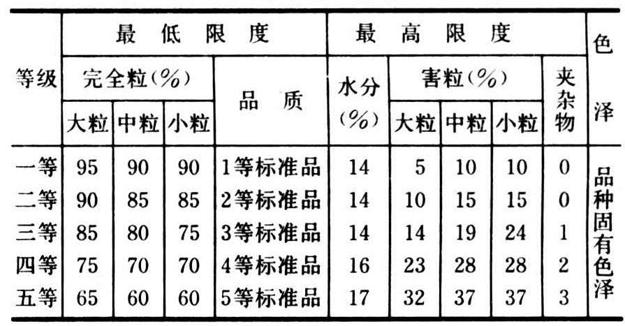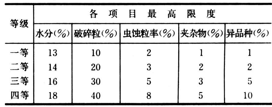 世界各国大豆商品质量分级标准不一。如日本将商品大豆分为5个等级(见表1)。美国分为4个等级(见表2)。中国大豆商品质量也有不同分级标准,但尚未形成统一的国家标准。