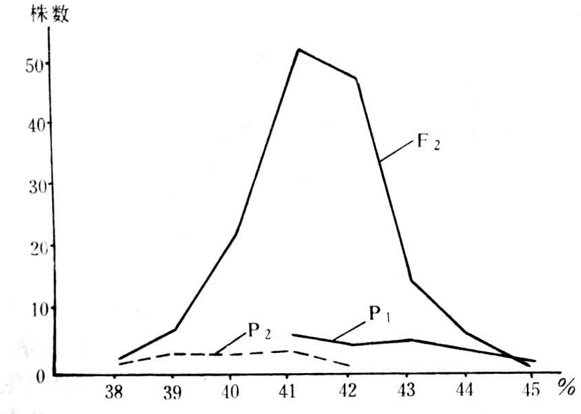 用蛋白质含量为43.0±1.75%的公交424-1与含量为40.7±1.11%的大弯大粒杂交,杂种第一代的蛋白质含量为42.0±0.52%,相当两亲本的均数,杂交第二代群体蛋白质含量作常态分布,变幅为38~45%,平均为41.8±1.20%(见图)。有一些大豆杂交组合,在杂交第二代中出现蛋白质含量有超亲本的后代。