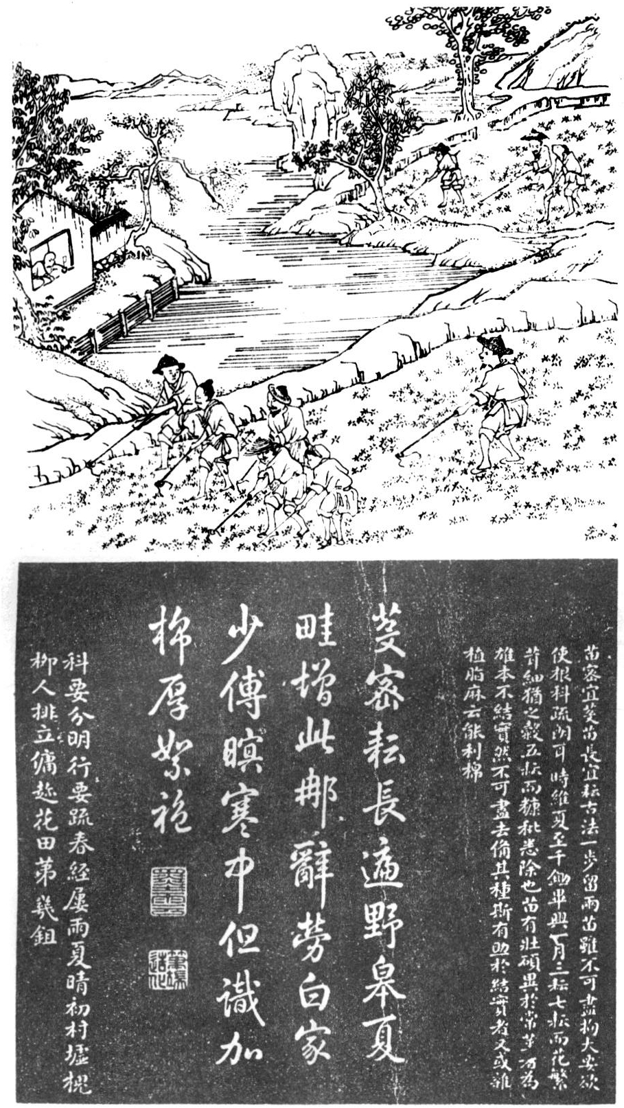 播种图的第一句诗说明了棉花是由外国引进的,“本从外域入中原……雨足清明方布种……”。说明中提出“种选青黑核,冬月收而曝之”是指选黑子(中棉)作种,冬天要曝晒。对播种期提出谷雨前种的叫“植棉”,谷雨后种的叫“晚棉”。“清明后淘取坚实者沃以沸汤”是指水选浸汤种,“和以柴灰”指拌种,种在“夹沙”(砂壤土)地里。灌溉图提出“种棉必先凿井,一井可溉四十亩,引水分流,自近彻远”。耘畦图提出“苗密宜芟(间除),苗长宜耘”,株距为“一步留两苗”,强调“根科疏朗”,使棉株通风透光,夏至时要勤锄。图中农民挥锄耘田,表现了辛勤劳动的神态。摘尖图提出“苗高一、二尺视中茎之翘出者摘去其尖,……旁枝尺半以上亦去尖,勿令交揉,则花繁而实厚”。诗句“尖去条抽始畅然,趋晴避雨摘炎天”,指要在晴天摘整主茎顶心和旁枝边心(见棉花整枝)。采棉图绘制了姿态各异的采棉妇女表露出丰收喜悦的心情,并提出“桃裂絮见为棉熟,随时采之,此枝已絮,彼枝犹花,相错如锦”,说明了摘棉期和棉株能连续不断的开花结铃的生长习性。拣晒图提到“棉贵纯白,土黄色者亦可织”,指当时种的白絮和紫絮中棉都可以用来纺织。收贩图提到了棉花的买卖和定价。轧核图“稔岁亩收子花百二十斤,次亦八九十斤,子花三得瓤花一”,提出了当时棉花的单产和衣分率的基本概念。织布图绘制了妇女在机房织布的图象,指出布以“缜密匀细为贵”。最后一幅练染图诗句“五色无论精与粗,……敬缵神尧耕织图”,说明了当时封建帝王对棉花生产与棉纺织业的重视。本图通俗易懂,是当时推广植棉和纺织技术的普及读物,曾刻石保存,现存于河北省博物馆。其拓本广为流传,1941年曾被译成日文出版;1986年,由河北省农业厅、河北农业大学编辑注释出版。