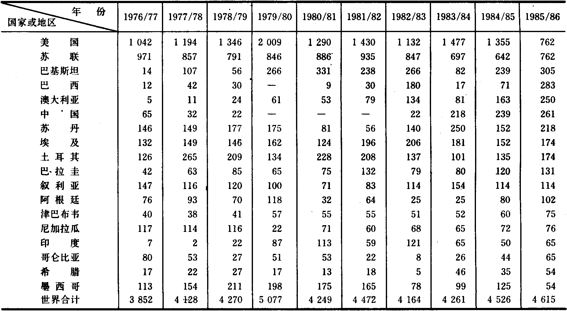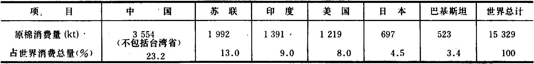 1984年消费100万吨以上原棉的国家有中国、苏联、印度和美国;50万~70万吨的有日本和巴基斯坦;这六个国家合计占世界原棉消费量总额的61.1%(见表1)