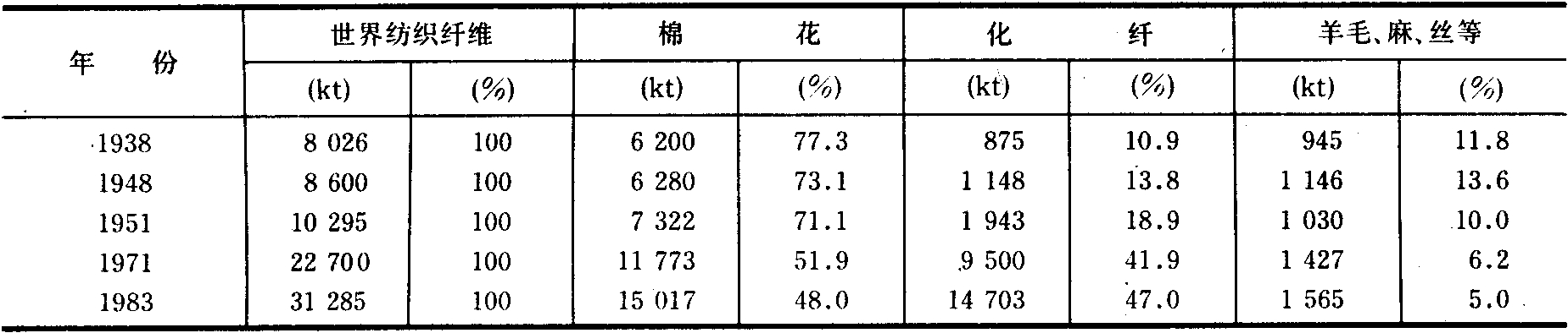 从20世纪30年代起,多种人造纤维产品投入市场,尤其是50年代以后,各种合成纤维生产迅速发展,在纺织纤维消费量中所占比重逐年上升,而棉花、羊毛、麻、丝等自然纤维相对地有所下降(见表3)。