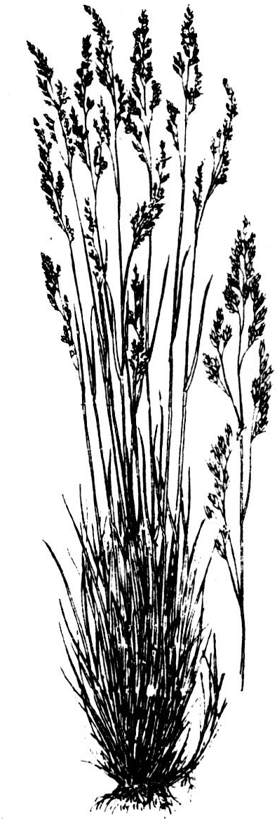 植株高40~75厘米,基部常倾斜或膝曲,有匍匐的根茎;叶片对折或内卷,下面平滑无毛,上面被茸毛,茎秆基部的叶鞘比节间长,而上部的则短于节间;圆锥花序狭窄,小穗淡绿,而先端带紫色,含3~6个小花,护颖大小不等,外颖棕带红色,常光滑或粗涩,顶端有芒,长短不一,均不到外颖的一半;种子很小,千粒重0.70克左右(见图)。
