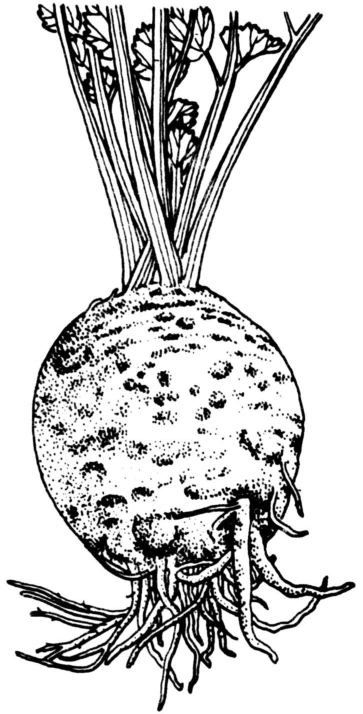 伞形花科(Umbelliferae)芹属中的一个变种,能形成肥大肉质根的二年生草本植物。学名Apium graveolens L.var.rapaceum DC.,别名根洋芹、球根塘蒿等,染色体数2n=2x=22。以脆嫩肉质根和叶柄供食用。可凉拌、炒食、煮食或做汤菜辛香料。还可榨汁作药用。原产于地中海沿岸的沼泽盐渍土地,由叶芹菜演变形成,1600年以前意大利及瑞士已有栽培根芹菜的记载。主要分布欧洲。植物学性状除肉质根外与芹菜同(见)。肉质根圆球形,膨大部分主要由短缩茎、下胚轴和根上部组成。在解剖学上肉质根属胡萝卜类型,最外层为周皮,向内为次生韧皮部,具发达薄壁细胞组织,为主要食用部分,向里为次生木质部。喜冷凉湿润。在土温20℃时生长量大,25℃时生长量较少。肉质根于炎热条件下易引起褐变和腐烂。适宜在供水良好、有机质丰富的轻松肥沃土壤栽培。根芹菜发芽期和幼苗期生长缓慢,播种到成苗需时80~90天,一般采用育苗移植。夏季冷凉地区,于早春在冷床育苗,夏初定植,秋冬收获。夏季炎热地区,于冬季在冷床或温床育苗,早春定植,初夏收获;或于夏季露地育苗,秋季定植,初冬收获。育苗期间,幼苗有3~4片叶时,按10厘米株行距分苗。苗床温度白天宜17~20℃;夜间12~15℃。9~10片叶幼苗定植,株距25~40厘米,行距25~40厘米。密度越大,肉质根越小。根系受伤后不易恢复,定植前后应采取护根及促根措施,以利根系恢复生长,促幼苗成活。植株生长前期,结合浇水早施追肥,促使根系扩展和肉质根适时膨大。后期需供水均匀,促进肉质根迅速膨大。生长期间需及时摘除老叶和侧生枝叶,在肉质根膨大期间,可把根际土壤扒开,用刀修去肉质侧根,使主根生长肥大,表面光洁,形状整齐。霜冻前收获,在0~1℃条件下贮藏。冬季可用肉质根促成栽培,生长嫩叶柄,温度要求14℃以上。选留健康的肉质根留种,贮藏越冬至翌年春土壤解冻后定植,春夏间开花结果。
