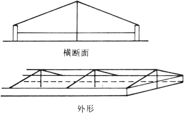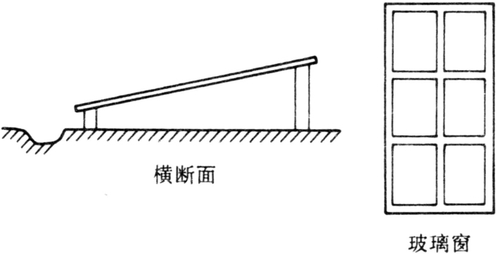 冷床有单斜面和双斜面两种类型(图1、2),中国南方的冷床有单斜面防风保温的围障。中国北方的冷床是由风障畦演变而来的,即是将风障畦的畦埂增高而成为畦框,并在畦面增加防寒保温和采光的覆盖物。原始的冷床分抢阳畦和槽子畦两种(图3),后来为增加种植面积,改善畦内小气候条件和方便管理而产生了改良阳畦。①抢阳畦:畦框是由垒土经夯实而成,北框高而南框低,风障向南倾斜,可使畦内在冬季接受更多的阳光,故名“抢阳畦”。一个畦的实际栽培面积为1.66×5.6米;②槽子畦:畦框的南北帮高度基本相等,风障直立。多在太阳高度角较大的春季使用,适宜作移植苗畦,也用以早熟栽培和软化栽培等。③改良阳畦:改良阳畦和普通阳畦的主要区别是增加土墙(后墙和山墙)和后屋面,土墙高1米、厚50厘米。山墙的最高处为1.5~1.7米。后屋面由立柱、柁、檩等支撑,上面覆盖土、芦苇、秸秆等保温。改良阳畦内空间大,劳动条件得到改善,其长度一般视栽培地块而定,宽度为6~7米。
