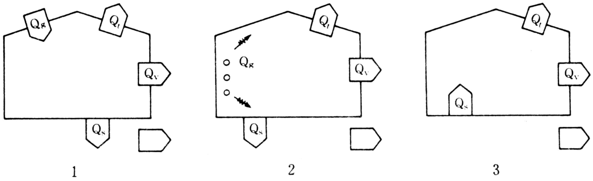 下图表示温室热量的收支情况:①在白天不加热的情况下,温室内得到的太阳热Qg用于贯流放热Qt,通风换气放热Qv和土壤传导失热Qs。②在夜间加热的情况下,补充的热量Qg也参与贯流放热、通风换气放热和土壤横向传导失热。③在夜间不加热的情况下,温室内白天积蓄的热量,用于贯流放热、通风换气放热和土壤横向传导失热。
