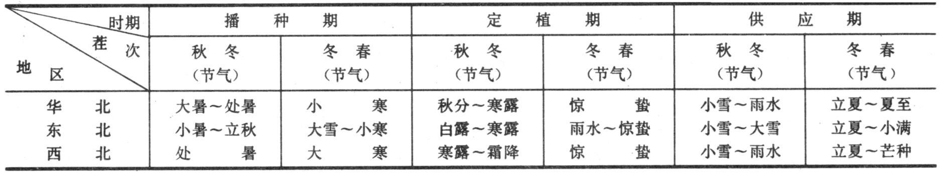 温室蔬菜的栽培制度,主要取决于栽培目的,同时也受温室性能和市场价格的制约。中国温室的生产季节多在秋、冬、春三季,主要供应期在冬春季,这时的市场价格也较高。夏季休闲,日光温室栽培受季节的限制较大,主要种植耐寒或喜冷凉的绿叶蔬菜和葱蒜类蔬菜。加温温室基本不受季节影响,以栽培黄瓜、番茄为主。在中国东北地区,温室黄瓜一年可种植两茬(表1),在北京、天津地区一年可种植三茬(表2)。在大多数地区,温室番茄一年种植两茬(表3)。世界一些主要温室蔬菜生产国,一般以求高产、长期均衡供应国内外市场为目标,实行一年一茬或一年两茬的栽培制度。一年一茬的生长时期为9月至次年7月;一年两茬的栽培时期为2月至7月和9月至次年1月。主要种植黄瓜、番茄、辣椒、莴苣等。