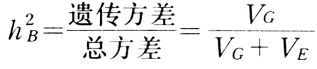 从基因作用分析,基因型方差可以进一步分解为三个组成部分:基因加性方差(V)、显性方差(V)和上位性作用方差(V)。基因加性方差是指等位基因间和非等位基因间的累加作用引起的变异量,显性方差是指等位基因间相互作用引起的变异量,而上位性方差是指非等位基因间的相互作用引起的变异量。基因加性方差占表现型总方差的比值,称为狭义遗传力h2N,其计算公式为: