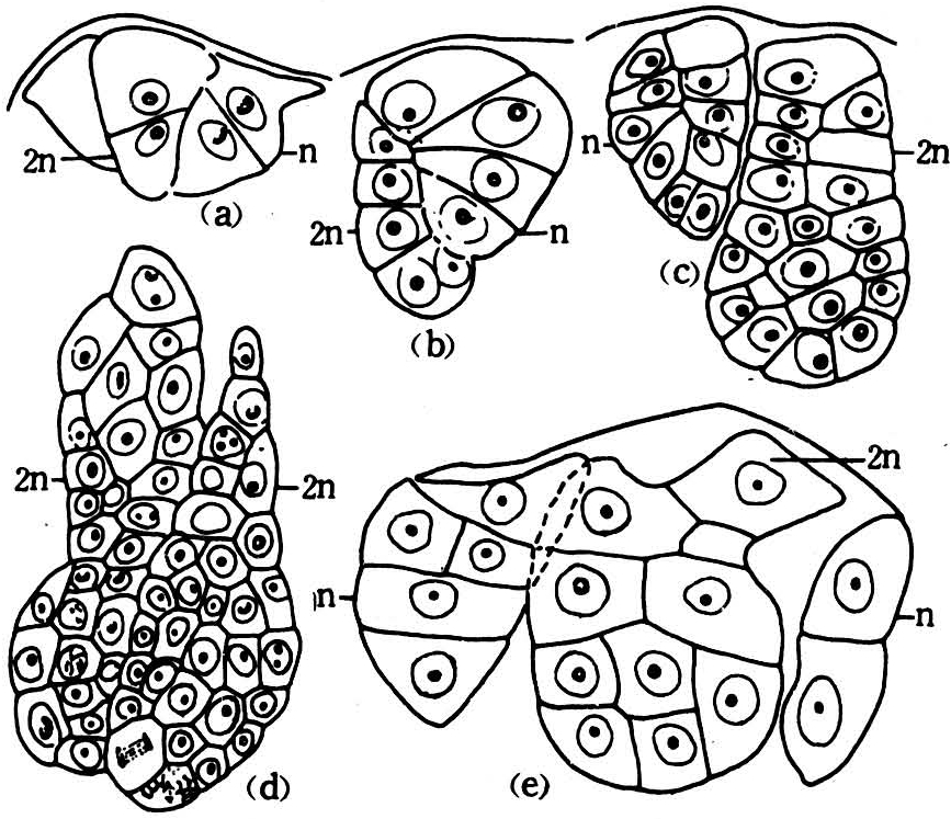 起源于珠心或珠被细胞,又称体细胞胚。珠心胚多由近珠孔端的珠心细胞产生,常含有浓厚细胞质及淀粉,通过活跃分裂形成胚性细胞群,挤入胚囊,形成不定胚。珠心胚在柑桔属中很普遍,可以有数十个珠心胚与合子胚共存一个胚囊中。杧果也有珠心胚,可多达50个,合子通常退化(图3)。仙人掌、兰科植物、蒲桃均有珠心胚。珠心胚通常缺胚柄,但小果橙有胚柄。珠被胚与受精无关。垂花绶草内珠被顶端及其下方细胞产生2~6个不定胚原胚,红花的珠被内表皮能产生不定胚原胚,但均未见进一步分化。