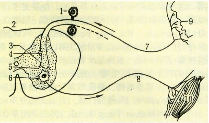 反射活动的结构基础是反射弧。一个完整的反射弧必须包括感受器、传入神经、反射中枢、传出神经、效应器五个组成部分(见图)。