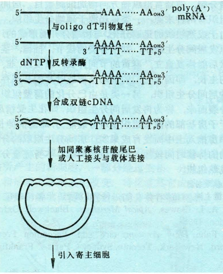cDNA克隆是以mRNA为原材料,经体外反转录合成互补的DNA(cDNA),再与载体DNA分子连接引入寄主细胞(图1)。每一cDNA反映一种mRNA的结构,cDNA克隆的分布也反映了mRNA的分布。cDNA克隆的特点是:①有些生物,如RNA病毒没有DNA,只能用cDNA克隆;②cDNA克隆易筛选,因为cDNA库中不包含非结构基因的克隆,而且每一cDNA克隆只含一个mRNA的信息;③cDNA能在细菌中表达。cDNA仅代表某一发育阶段表达出来的遗传信息,只有基因文库才包含一个生物的完整遗传信息。