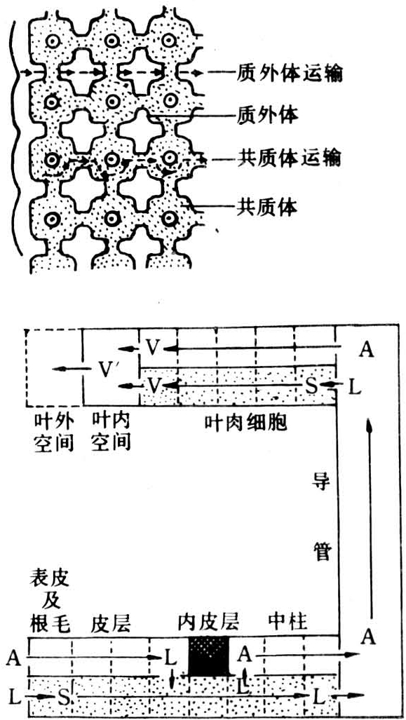 相邻细胞间通过胞间连丝彼此相连,使高等植物的各种组织构成一个整体,即共质体。物质由胞外经细胞膜进入共质体通常为主动运输过程。在共质体内运输时,除在长形细胞需要通过原生质体环流作主动运输外,主要通过胞间连丝被动扩散,尤其是当内皮层细胞次生壁加厚后,内皮层细胞的胞间连丝就成为联系根部皮层与中柱之间物质运输的重要通道。由共质体运输转入木质部导管的质外体运输时,是一种分泌的主动过程。特别是K+之类的阳离子,从木质部薄壁细胞进入导管细胞,是逆化学势梯度移动,需要有载体蛋白参与并消耗ATP。有机物质的远程运输主要在韧皮部的筛管细胞中进行,筛管细胞之间的胞间连丝是筛管细胞中唯一无损地保留结构和功能的细胞器,靠筛板上的筛孔彼此沟通。有机物质在筛管中的运输速度比普通扩散速度大2~4万倍。它受各种外界条件的影响,当温度在5~30℃范围内,速度随温度的上升而加快,将叶柄或部分茎段以低温处理,则运输受阻,采用呼吸抑制剂处理或隔绝氧气也可明显抑制运输过程(见有机物运输)。