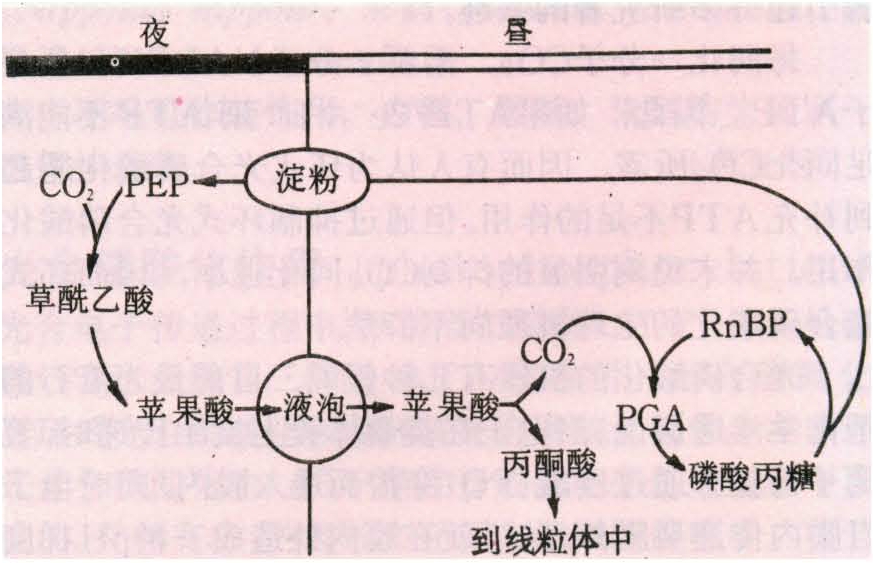 这条代谢途径因首先在景天科植物中发现而命名;以后又在其他肉质植物中发现。这类起源于热带的植物,气孔在夜间开放,白天关闭。夜间吸收并固定CO2,CO2受体亦为PEP,它与CO2反应形成草酰乙酸,然后草酰乙酸还原形成苹果酸,贮存在液泡内,白天转移到细胞质,脱羧释放出CO2进入叶绿体,经C3途径形成磷酸丙糖,进一步转化成淀粉贮存在叶绿体中。夜间淀粉降解,降解产物又形成PEP,又可作为CO2受体(图3)。景天酸代谢起了CO2库的作用,使这类植物白天在气孔关闭条件下仍有CO2进行光合作用。这一代谢途径是这类植物对炎热干旱环境的一种适应方式,夜间气孔张开、白天气孔关闭既可吸收到足够的CO2,又可减少水分消耗。