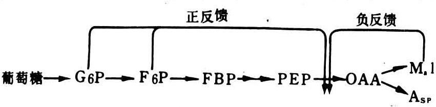 C3、C4途径都可通过不同方式自动调节。一些酶在黑暗中呈钝化态,而在光下则呈活化态,C3途径中的RuBP羧化酶-加氧酶、磷酸丙糖脱氢酶、果糖-1,6-二磷酸酶、景天庚糖-1,7-二磷酸酶及Ru5P激酶以及C 4途径中的丙酮酸、磷酸双激酶和NADP-苹果酸脱氢酶都是光调节酶。它们在黑暗中呈钝化态可保存底物,在光下呈活化态可促进C3或C4途径的运转。C3途径中形成的磷酸丙糖可转化为蔗糖或淀粉,亦可再进入循环形成更多的RuBP,这种反馈作用使循环运转加快,促进光合作用的进行,故有自动催化的性质。C4途径中催化CO2固定的酶——PEP羧化酶为磷酸己糖所活化,而为其产物C 4-双羧酸所抑制(图4),葡糖-6-磷酸(G 6P)或果糖-6-磷酸(F6P)活化PEP,当C4-双羧酸形成较多时则抑制PEP羧化酶作用,使C4途径的运转速度与维管束鞘细胞内的C3途径保持协调。