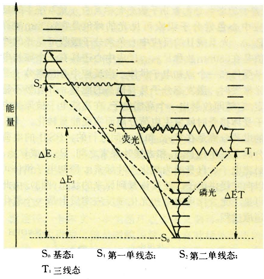 当叶绿素分子接受一个光量子后,其中π电子获得能量从基态跃迁到激发态(第一单线态或第二单线态)。此时光能转移至高能电子中。如果叶绿素分子被蓝光激发,电子跃迁到能级较高的第二单线态;如果被红光激发时,电子跃迁到能级较低的第一单线态。处于单线态的电子,其自旋方向保持原有状态,如果电子在激发过程中其自旋方向发生了变化,该电子就进入能级较单线态低的三线态(图1)。从激发态回至基态时,其能量以光量子形态释放,即发射出荧光和磷光。