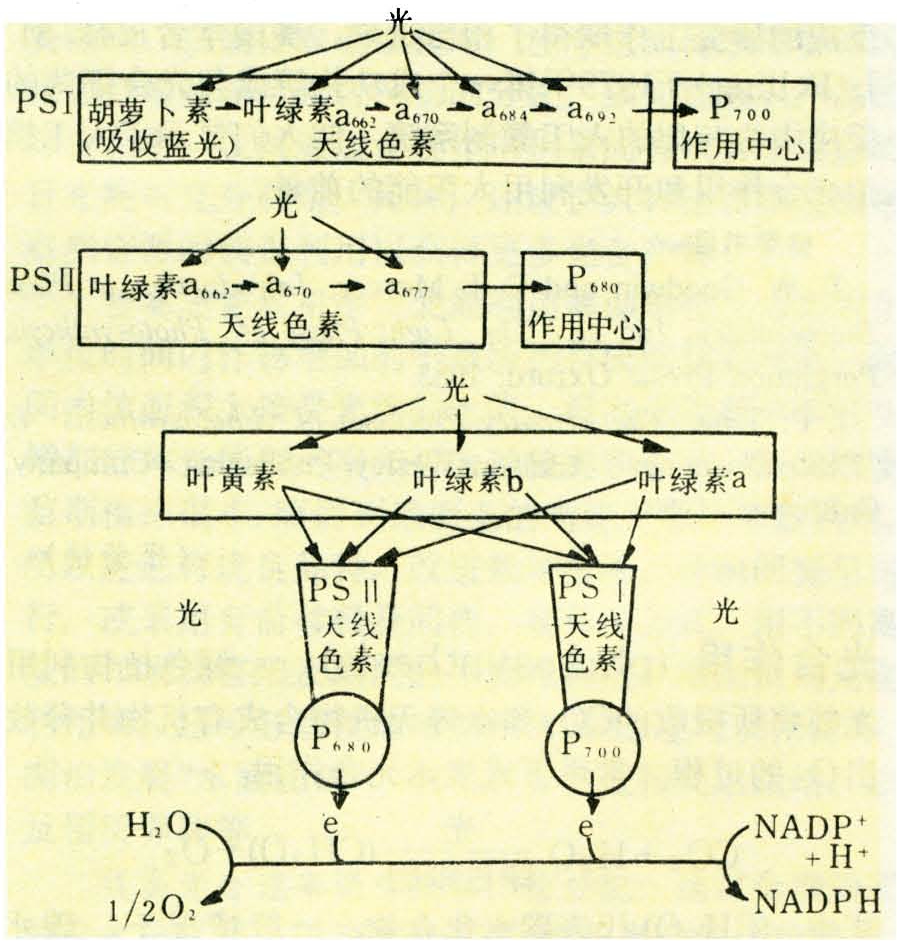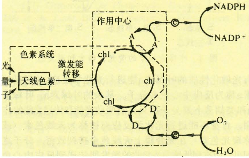 从类囊体膜上已经分离得到两种能进行光化学反应的色素——蛋白复合体,即光系统Ⅰ(PSⅠ)和光系统Ⅱ(PSⅡ)。色素—蛋白复合体中的色素分子中,只有少数处于特殊状态的、具有光敏化性质的叶绿素a能进行光化学反应,这种叶绿素a称为反应中心色素分子。其余的叶绿素a、叶绿素b和类胡萝卜素分子都只具有吸收光能和传递光能的作用,自身不能进行光化学反应而被称为天线色素(或称聚光色素)。在光合膜上天线色素排列致密,分子之间可以由高到低地向将吸收的激发能传递到反应中心色素分子。反应中心色素分子和天线色素分子按1∶250~300组成一个光合原初反应的最小单位,其中只有1~2个叶绿素a分子具有光敏化性质。在这两类色素分子协同作用下完成光合原初反应(图2)。