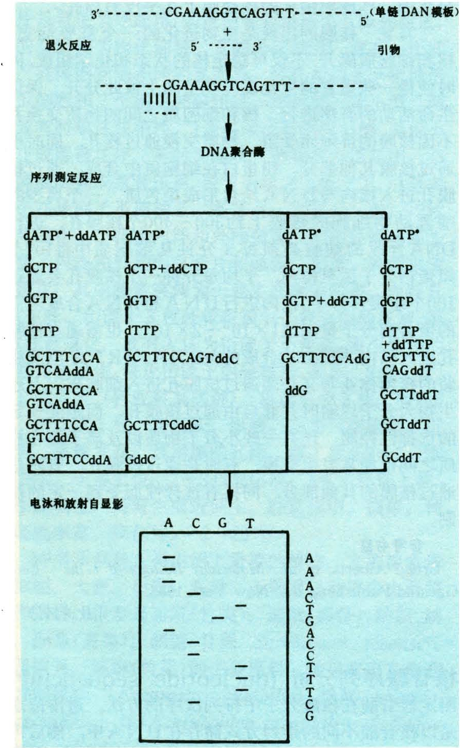 桑格的方法称为末端终止法。在这个方法中通常把要测定的DNA片段用重组DNA技术接在病毒M13载体上,让病毒产生带待测的DNA片段的单链DNA模板。首先把模板和一段短的互补寡核苷酸(称为引物)放在一起加热,然后慢慢冷却,让模板和互补寡核苷酸结合在一起,这一步称为退火。第二步是序列测定反应。把退火好的混合物分成四份,每一份中都加入DNA聚合酶和四种脱氧核苷三磷酸(dNTP,其中一种带有放射性同位素作为标记,在图1中以dATP*为例)。所不同的是每一份中加入的双脱氧核苷三磷酸(ddN T P)是不同的。当新生链在D N A聚合酶催化下延伸时,按照模板所规定的序列,后一个脱氧核苷三磷酸的5′-α-磷酸连接到前一个脱氧核苷酸的3′羟基上。如果在底物中含有一定比例的ddNTP,由于ddNTP缺少3′羟基,DNA链的延长就会在已掺入ddNTP的位置上停下,显然,停止的位置取决于模板的序列和用哪种ddNTP。例如用ddATP,则链终止的位置必然是相应于模板中的T的位置。由于ddATP掺入的位置是随机的,在每一个对应于T的位置上DNA链的延长反应都可能终止。因此通过这样一个反应就可以获得一组以A为末端的长短不一的片段。通过电泳,把长短不一的片段一一分开。观察片段的前后位置,就知道A在DNA中的序列。同样,用其他三种ddNTP为链终止的反应物可以确定C、G和T的位置(图1、图2)。