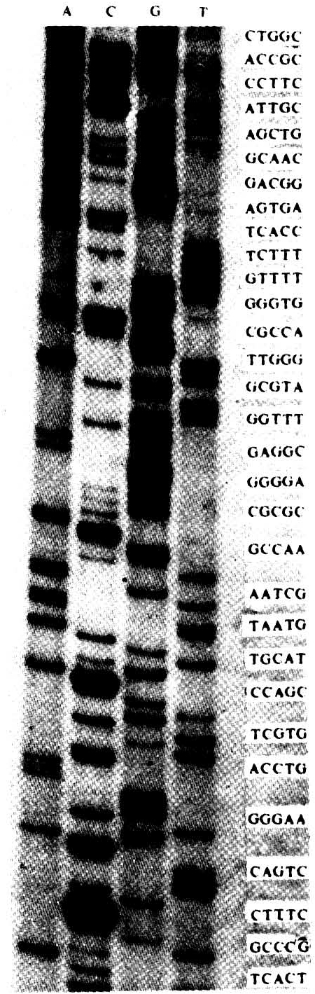 吉尔伯特的方法通常称为化学降解法。把一端带有同位素标记的DNA片段在四种不同的条件下用化学试剂处理,每一种反应使得DNA片段分别在特定的碱基处断开。常用的四种反应是①G反应。用硫酸二甲酯甲基化G的3位,然后用哌啶处理,造成DNA链在G核苷处断裂;②A+G反应。用甲酸处理可使得G和A同时从DNA链上脱落,经过哌啶处理,脱嘌呤的DNA链在G和A核苷处断开;③T+C反应。用肼然后用哌啶处理,DNA链在T和C核苷处断裂;④C反应。当存在高浓度的氯化钠时,用上述T+C反应,DNA链仅在C核苷处断裂。如果反应的条件选择得合适,则每种反应产生一组长短不一,但分别在特定的碱基位置断开的片段。同桑格的方法一样,把四种反应物在并列的位置上电泳,然后放射自显影,也可以直接从胶片上读出DNA的序列。