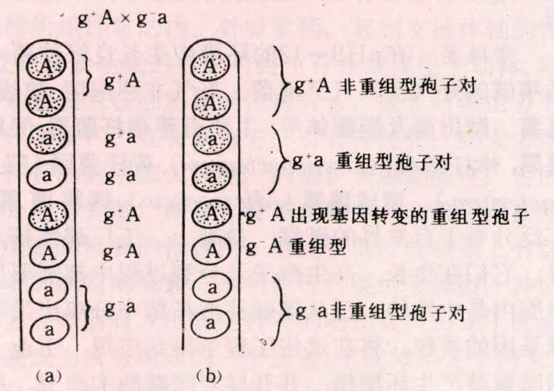 每个子囊中的子囊孢子是减数分裂的产物,便于进行四分体分析。特别像链孢霉之类的子囊菌,子囊中的子囊孢子成直线有顺序的排列,最易分析其分离情况。林格伦(C.C.Linde-green)于20世纪40年代末报道了在酿酒酵母的A×a的杂交中,发现有些子囊中的孢子不是2A∶2a,而是3A∶1a或1A∶3a。奥利夫(L.Olive)等用类生粪壳菌(Sordaria fimicola)的g+(黑子囊孢子)和g-(灰子囊孢子)两种菌株杂交,在子代中出现g+和g-的5∶3、6∶2及4∶4的分离。在4∶4的分离中,虽然g+和g-的孢子均为4个,但两种孢子不是成对排列,仍属异常分离。他们还发现在这些异常分离的子囊中,和g紧密连锁的其他标记基因却是4∶4的正常分离(图1)。这一结果说明基因转变发生在减数分裂后的有丝分裂过程中,所以异常分离又称为减数后的分离。由于基因转变的子囊孢子旁边总是伴随着重组型孢子,因此基因转变实质上是某种形式的染色体交换的结果。